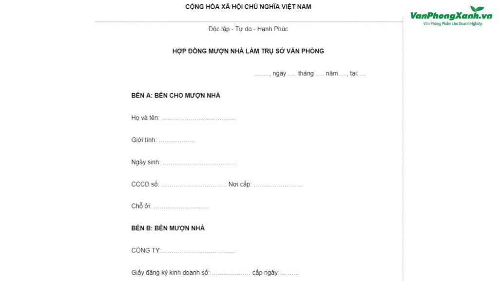 26 Th11 Xu hướng xã hội Mẫu hợp đồng mượn nhà làm văn phòng mới nhất 2025 26 Tháng mười một, 2025 By vui.tb@vanphongxanh.vn 0 comments Trong bối cảnh thị trường bất động sản và nhu cầu kinh doanh ngày càng sôi động, việc mượn nhà làm văn phòng trở thành lựa chọn phổ biế...Đọc tiếp