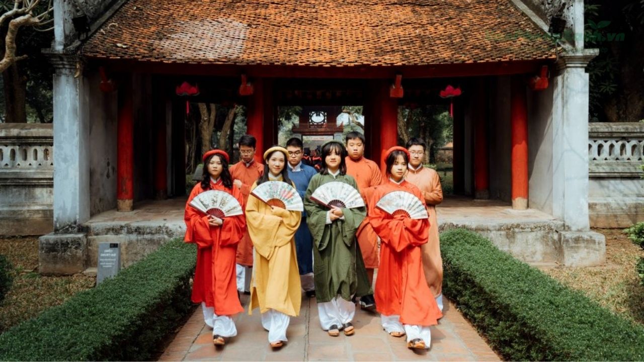 Gợi ý concept: Áo dài trắng, áo cử nhân, hoặc trang phục học trò truyền thống. Có thể chụp nhóm trong sân gạch rộng, dưới tán cây cổ thụ, hoặc trước cổng Văn Miếu với tấm bảng ghi danh rực đỏ.